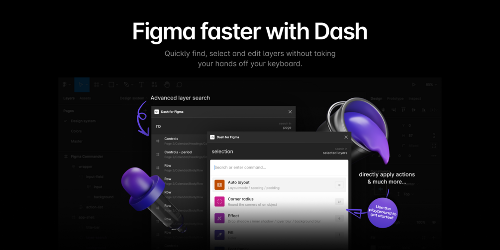 With Dash you quickly find, select and edit layers without taking your hands off your keyboard. Dash consists of 2 parts: